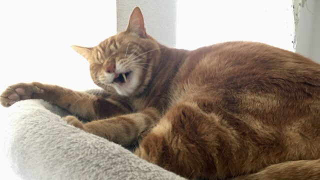 ふと、棚の上の箱でねるむぎさんを見ると何とも言えない表情をしていました。