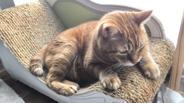 さっきまでの喧騒はどこへやら。落ち着いて毛づくろいするむぎさん。