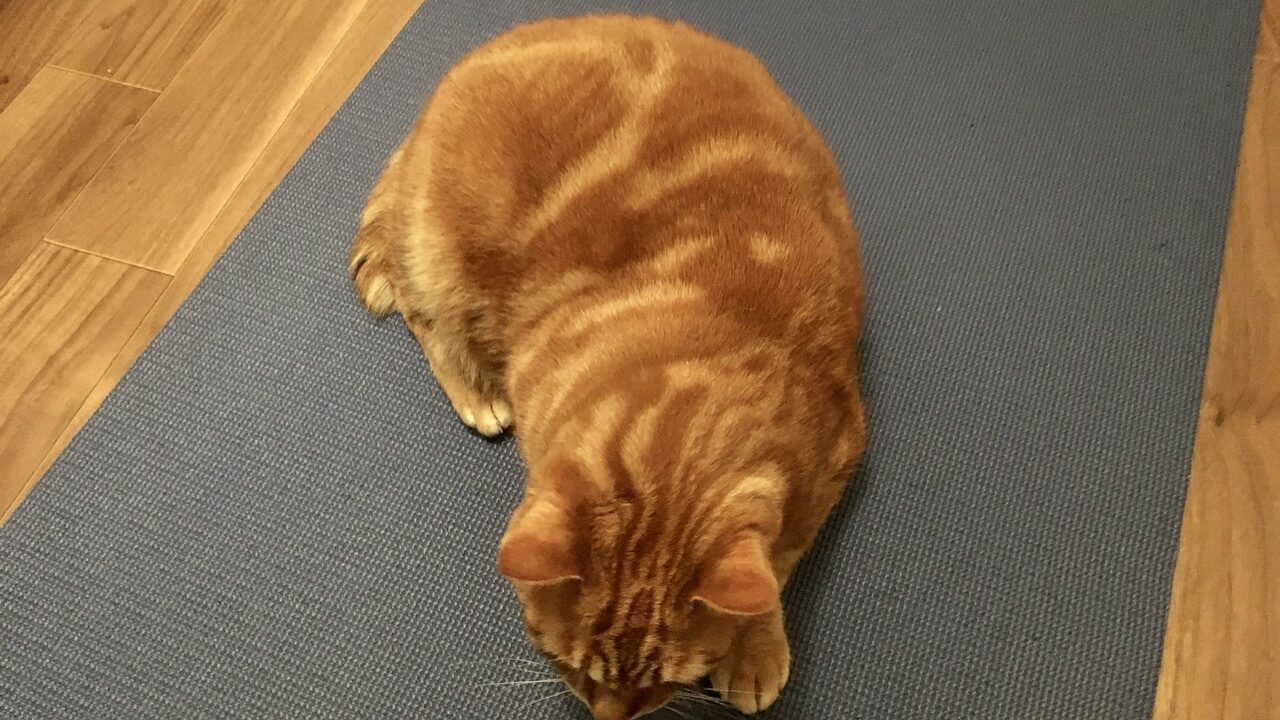 マットでストレッチしているとすかさず一緒にマットに転がりに来るむぎさん。