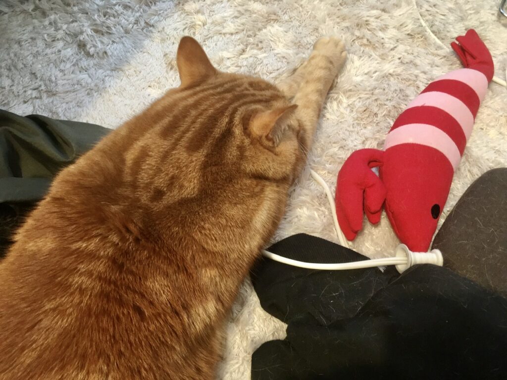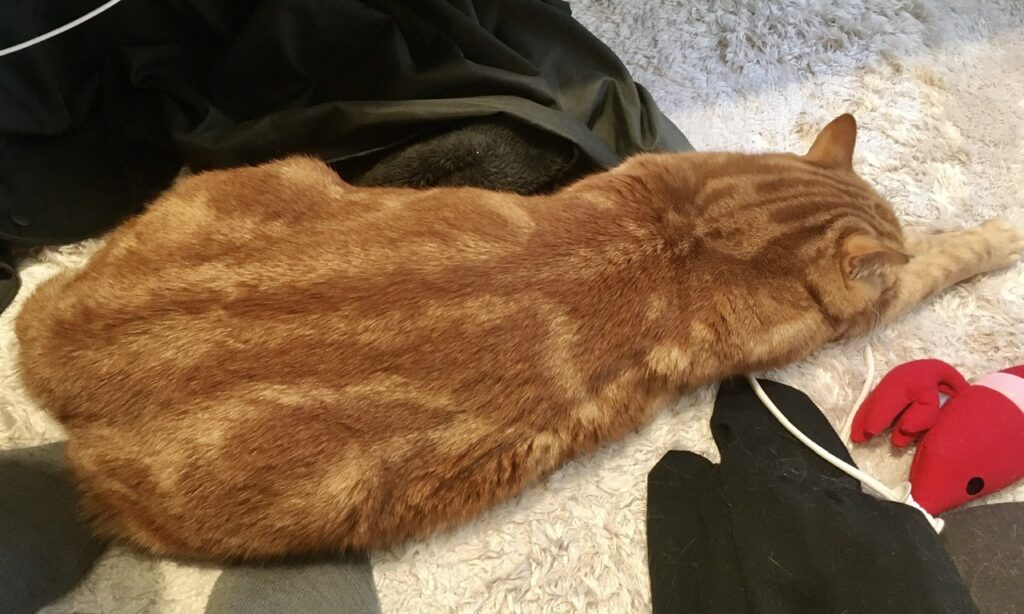 むぎさんは朝から布団で寝ていましたが、トイレに起きてホットカーペットがついているに気付くとたちまちご覧の通り。