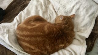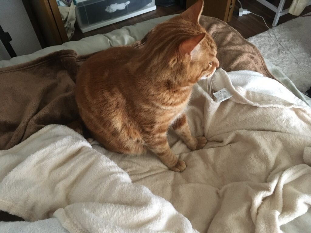 むぎさんも寝る時は布団の上、私の足の間で寝ています。むぎさん用のブランケットはもちろん毛だらけ。洗う前に毛がどれだけ取れるのか…大変だけどちょっと楽しみです。