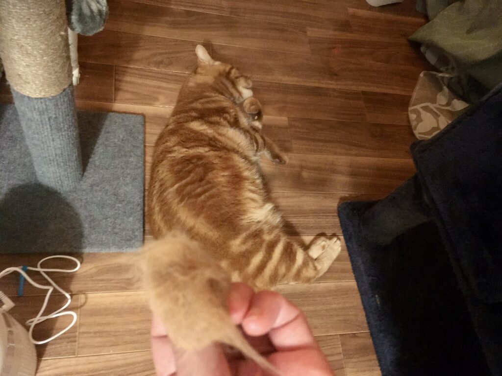 丸めた毛玉で遊ぶむぎさん。それは君の分身だよ。