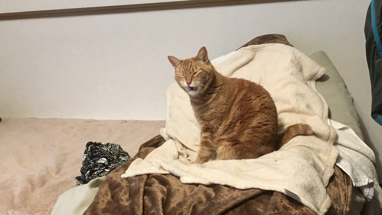 私が起きたことに気付き、寝ぼけ眼で「おはにゃう」とあいさつしてくれるむぎさん。