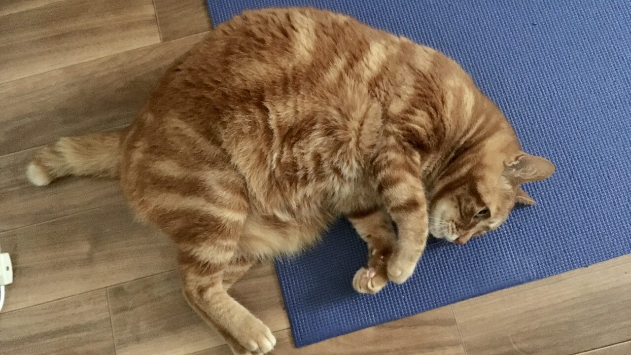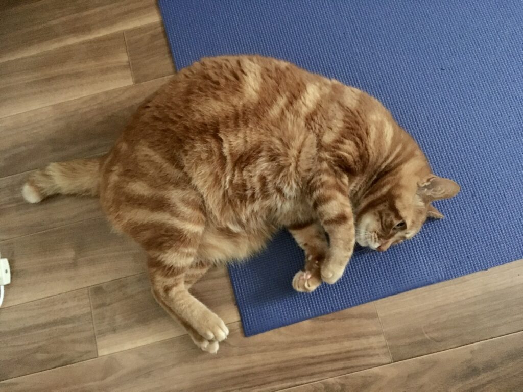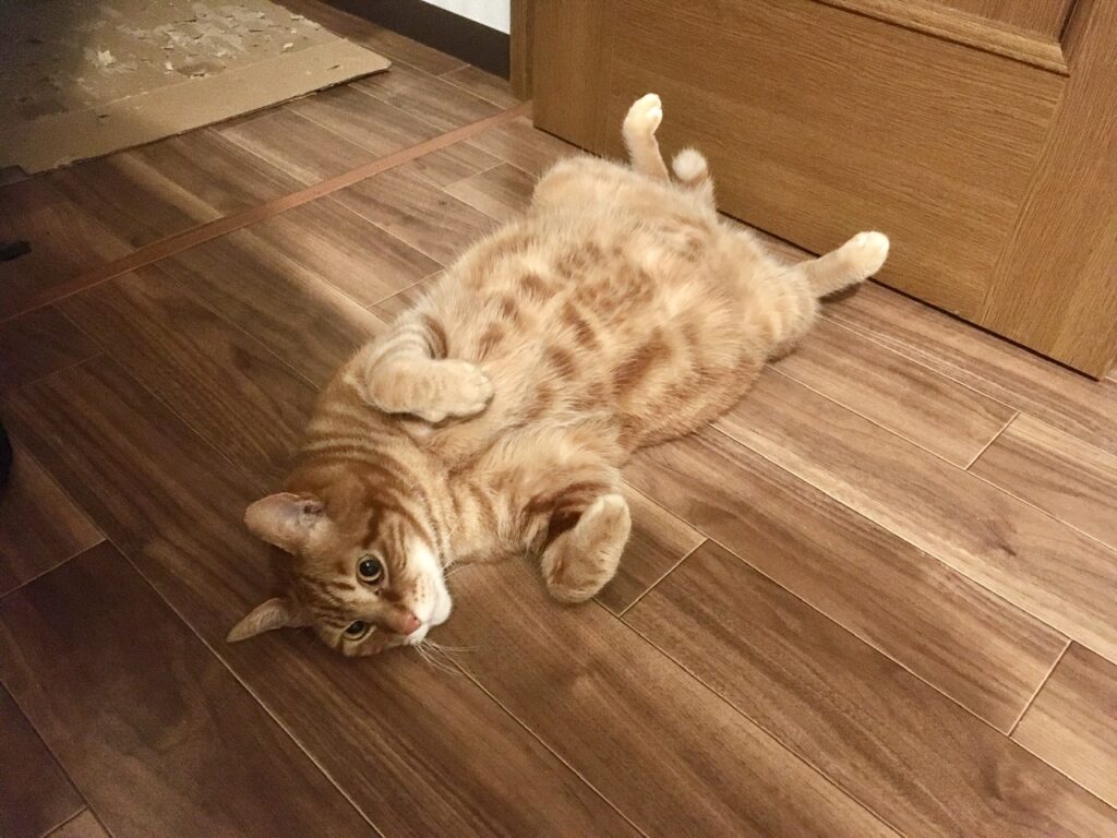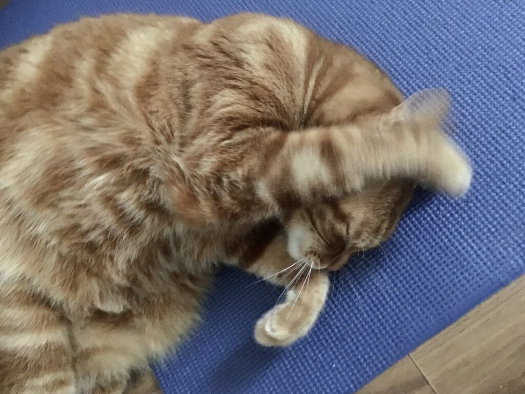 先日の雨でまた少し気温が上がり、むぎさんも床でヘソ天に。換毛も進んでいます。