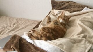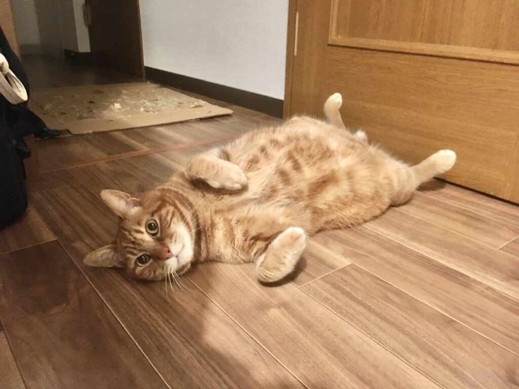 こちらはその朝の様子。出かける直前に寝転がって撫で待ちするむぎさん。