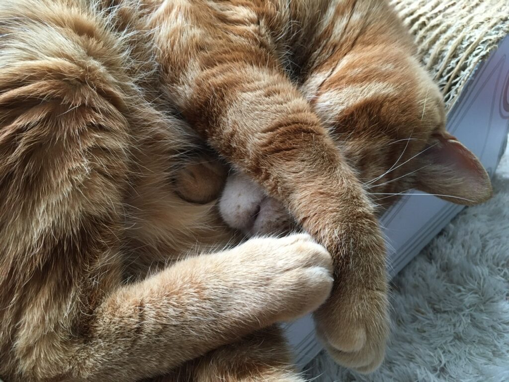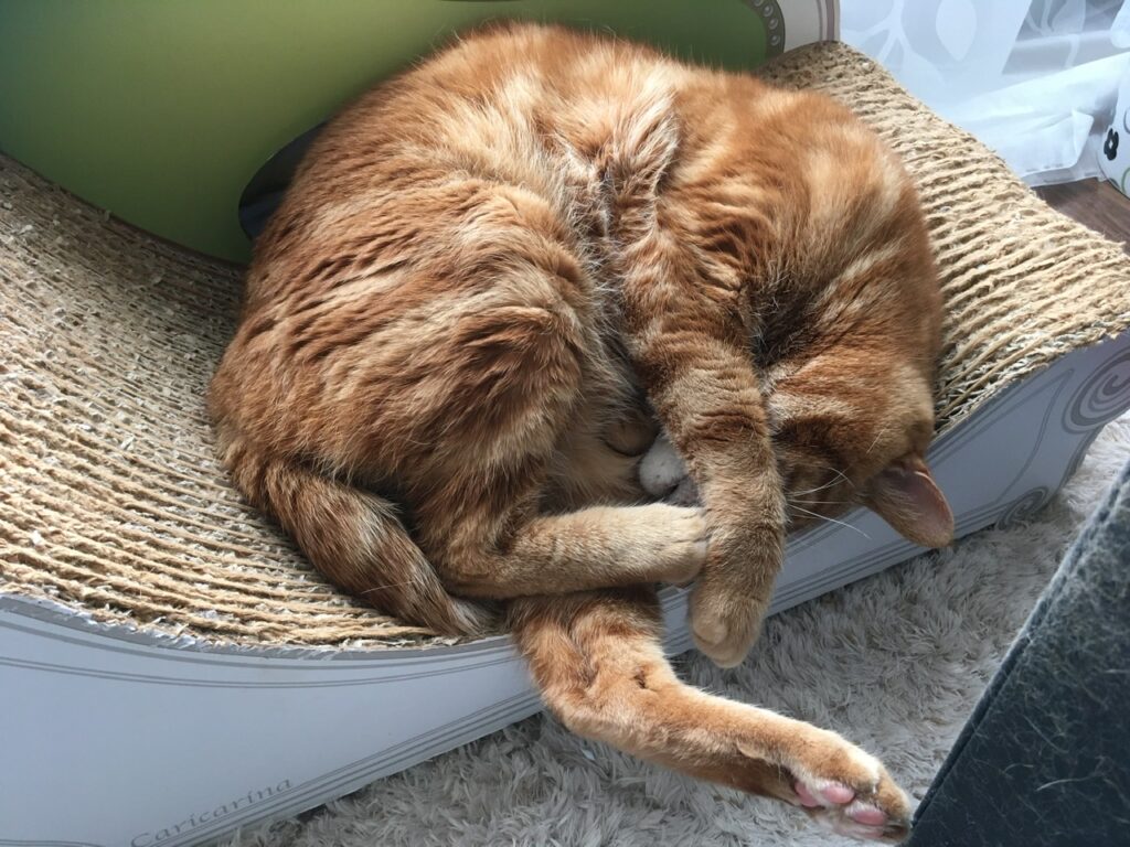 むぎさんも朝から彼なりにバタバタ走り回ってひと仕事。謎のドタバタが落ち着くと今度はカリカリーナで「寝る」仕事です。
