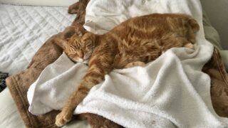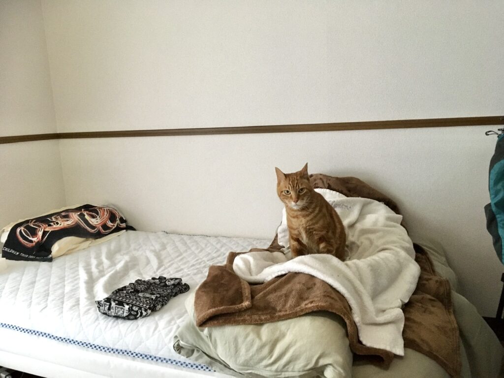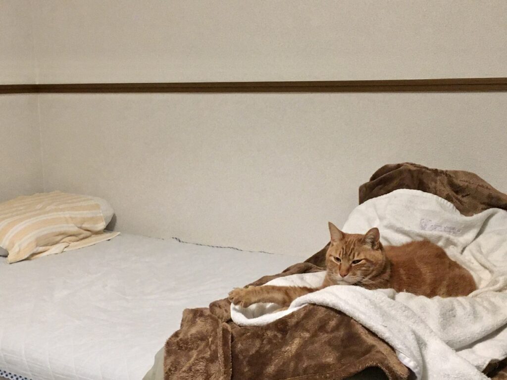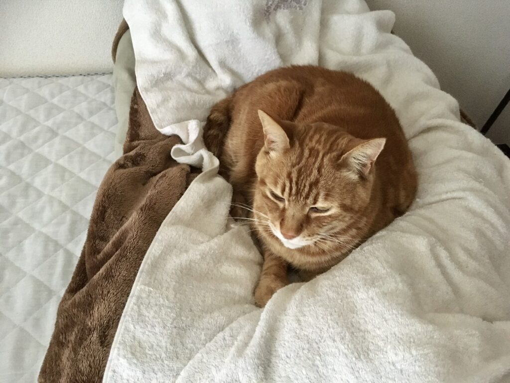 長袖を着て、膝掛けも使用。人間はこうして調整できますが、猫は一丁裏…保温のために布団で丸くなって寝ていました。