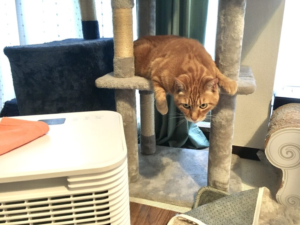 そんな除湿機をキャットタワーから監視するむぎさん。風が出てくるのが気になるのでしょうか。
