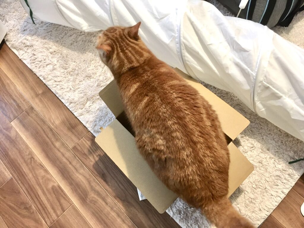 プロテインのパウチはもちろんのこと、箱にももちろん興味が湧いてしまう猫の性。