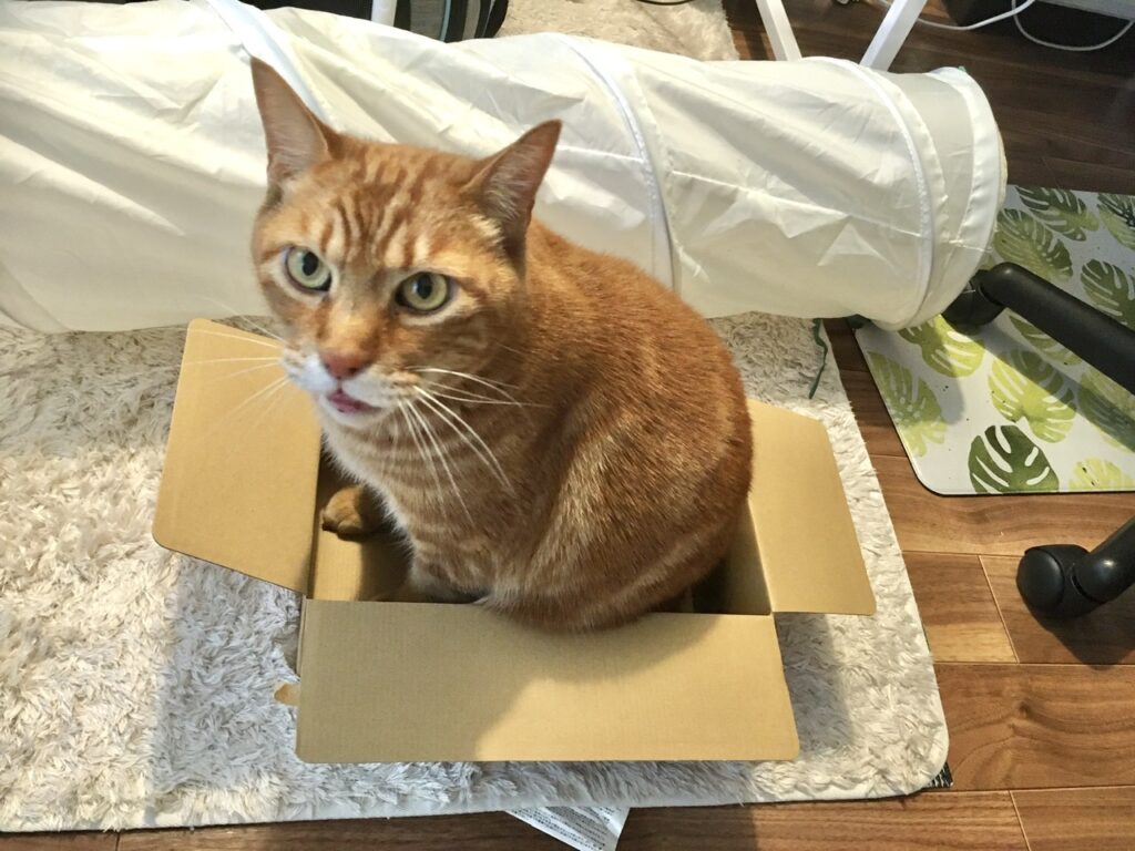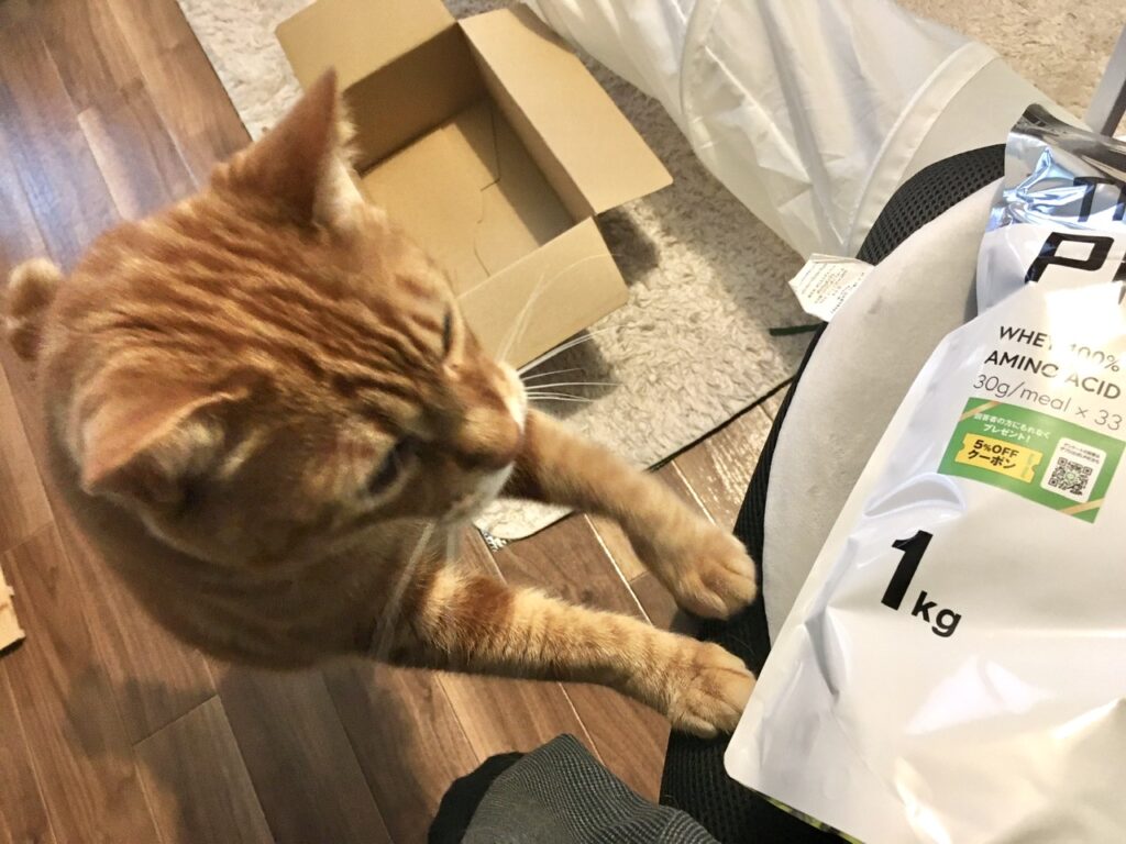 そして冒頭にある通り、プロテインを買いました。箱を開けたらたちまち「それなにー!?」と見にきたむぎさん。