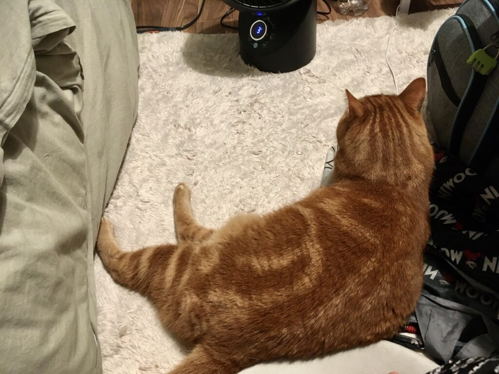 その後、扇風機で一緒に涼んでいました。猫は汗をかかないので気化熱で冷えることはないのですが、少しは風で涼しさを感じてもらえたでしょうか。