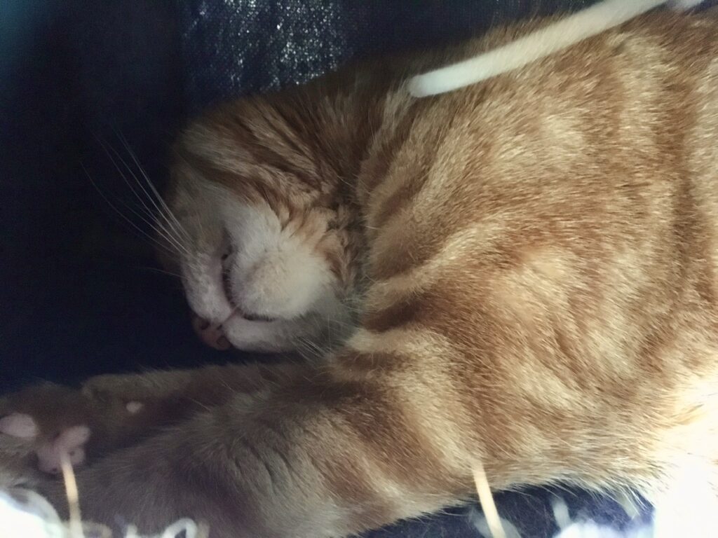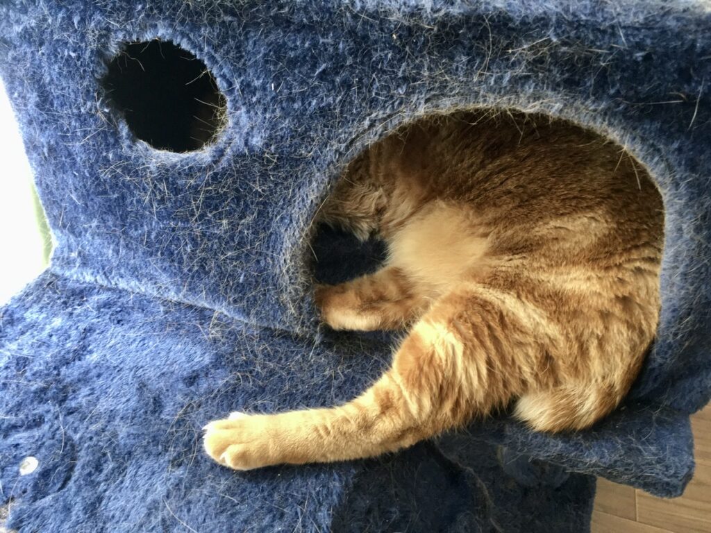 それにもかかわらずむぎさんはキャットタワーの小部屋で爆睡中。