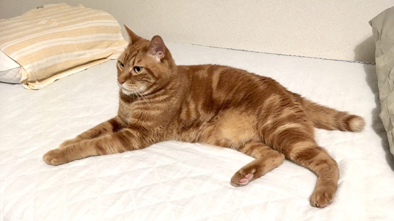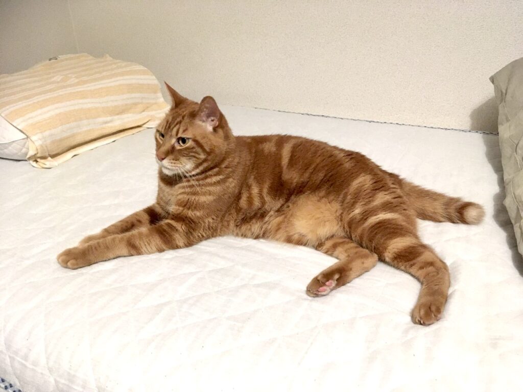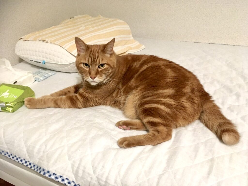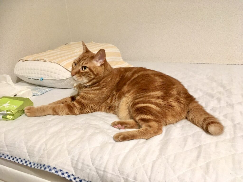ようやく私のベッド(マットの状態)もむぎさんのなわばりとして認定してもらえたのかもしれません。