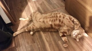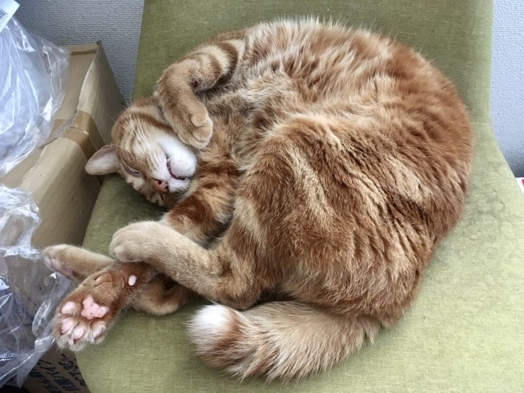 かいぬしを起こして朝ごはん第二弾を食べ、トイレが片付いたのを確認するむぎさん。その後は別の部屋に行き、椅子の上で爆睡モードへ。
