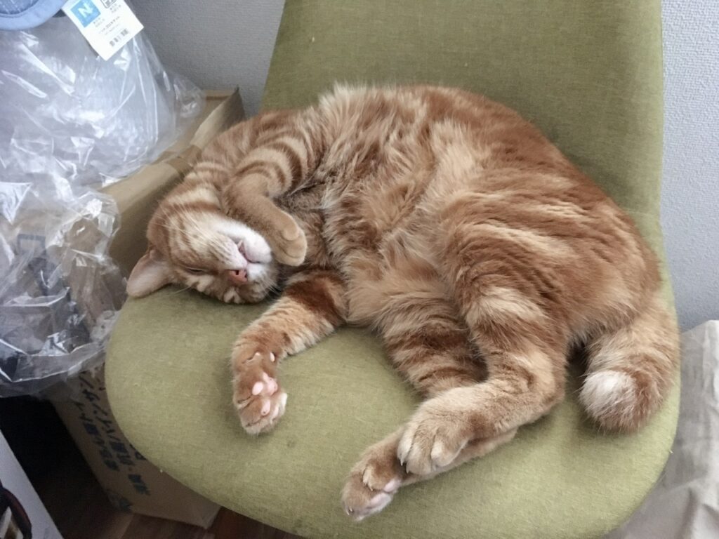 ちなみにこの椅子が置いてある部屋はエアコンがなく冷気が届きにくいのですが、けっこう好んでここで寝ています。椅子でなくてもマットに寝転んでいたりするので、人にはちょっと暑くてもむぎさん的にはいい室温のよう。