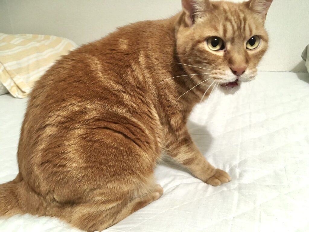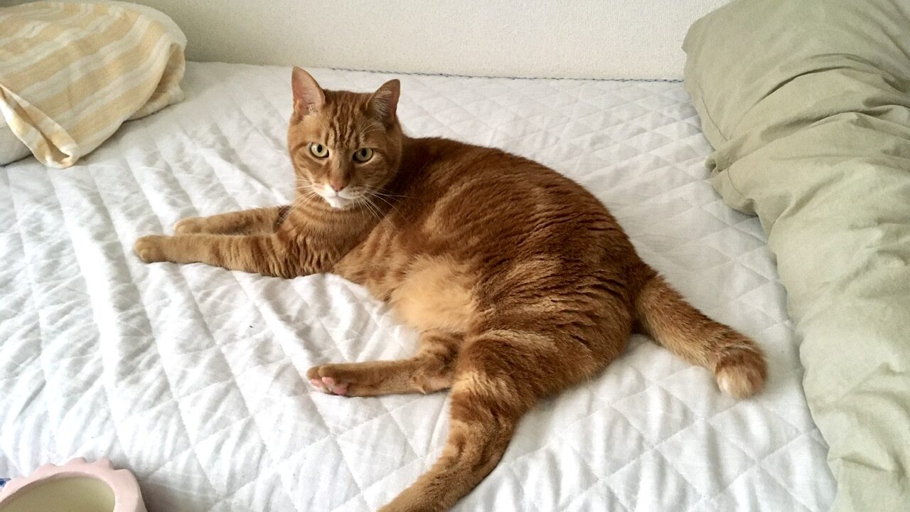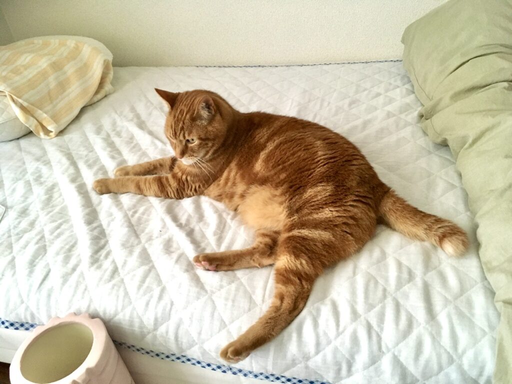 いや、いわゆる雑種の猫としては大きめだな~というのは元々思っているところですが(実際に見た方にも「大きい!」と言われたことがある)、こうしてベッドの上に居るといっそうそれが際立ちます。