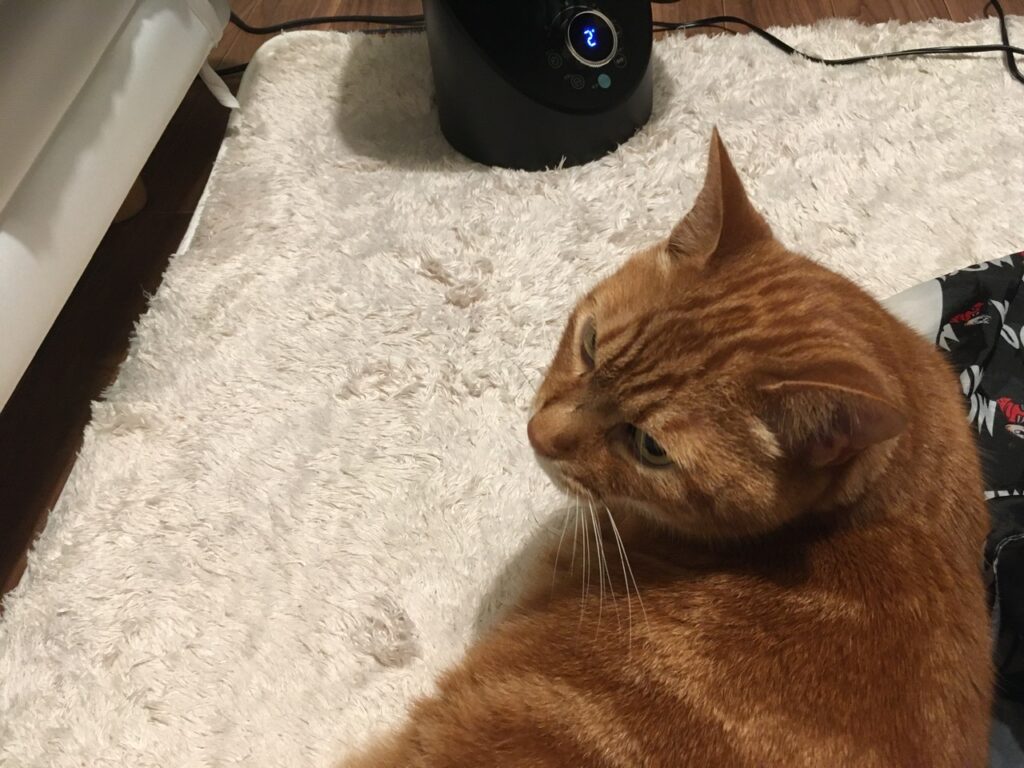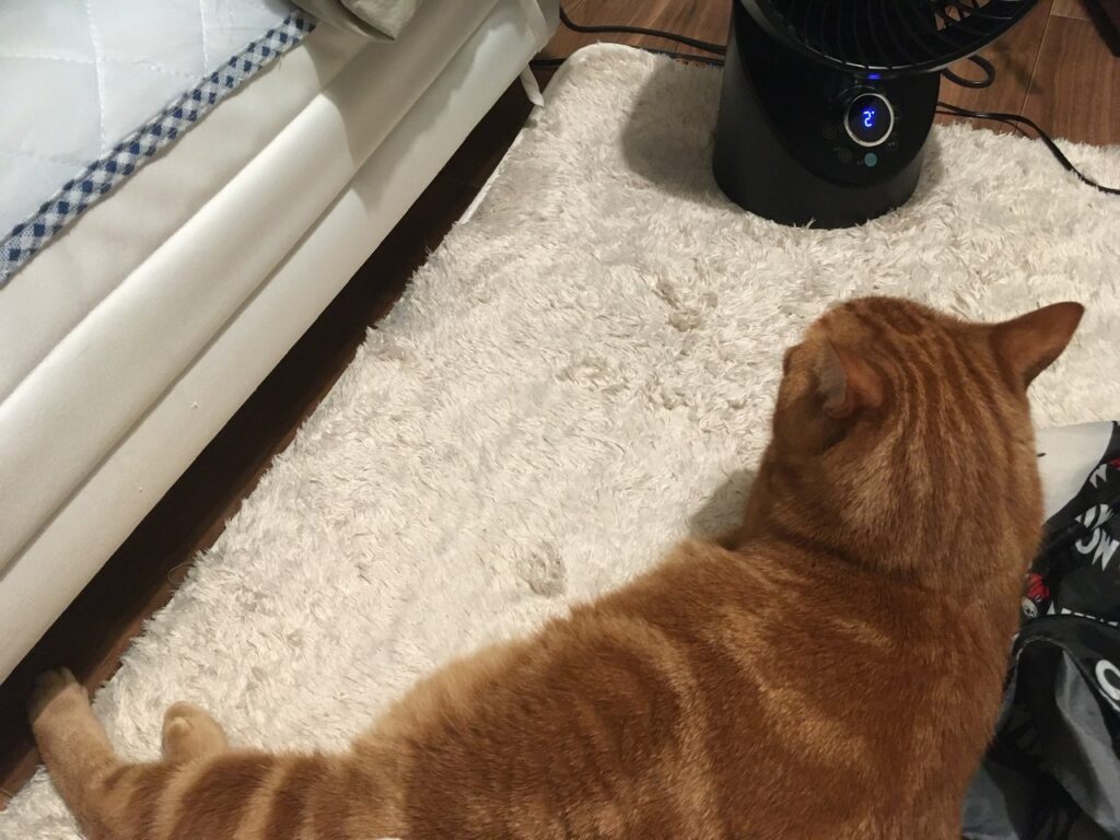 その割に扇風機の前を陣取るむぎさん。風に吹かれるのは好きなのかな?