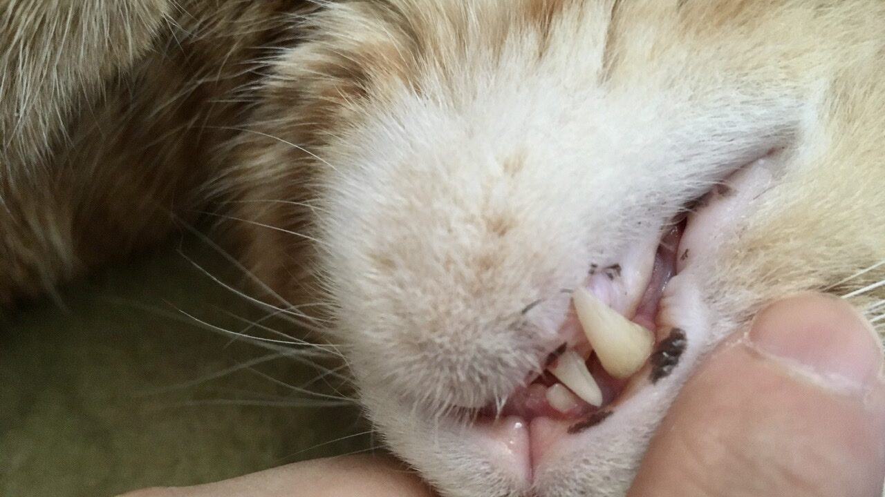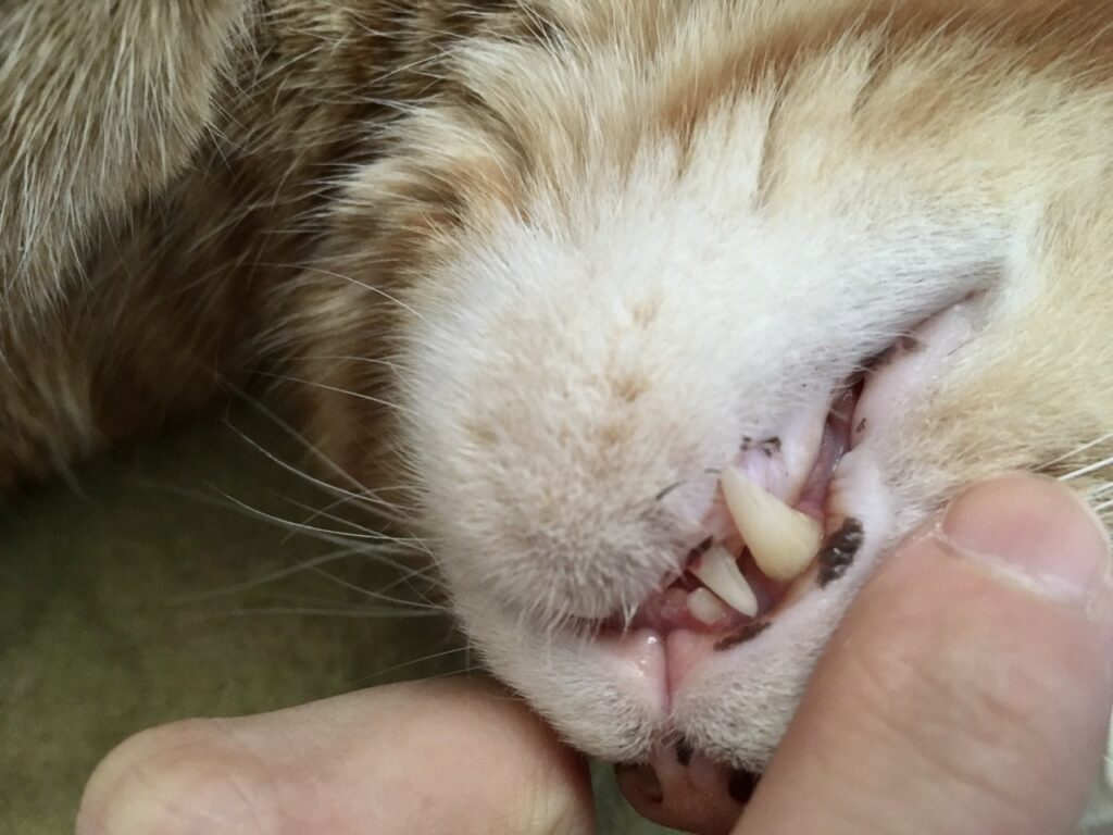 上のキバの根元に少し歯垢があるような…?そして今気づきましたが下の歯の根元がちょっと赤い??