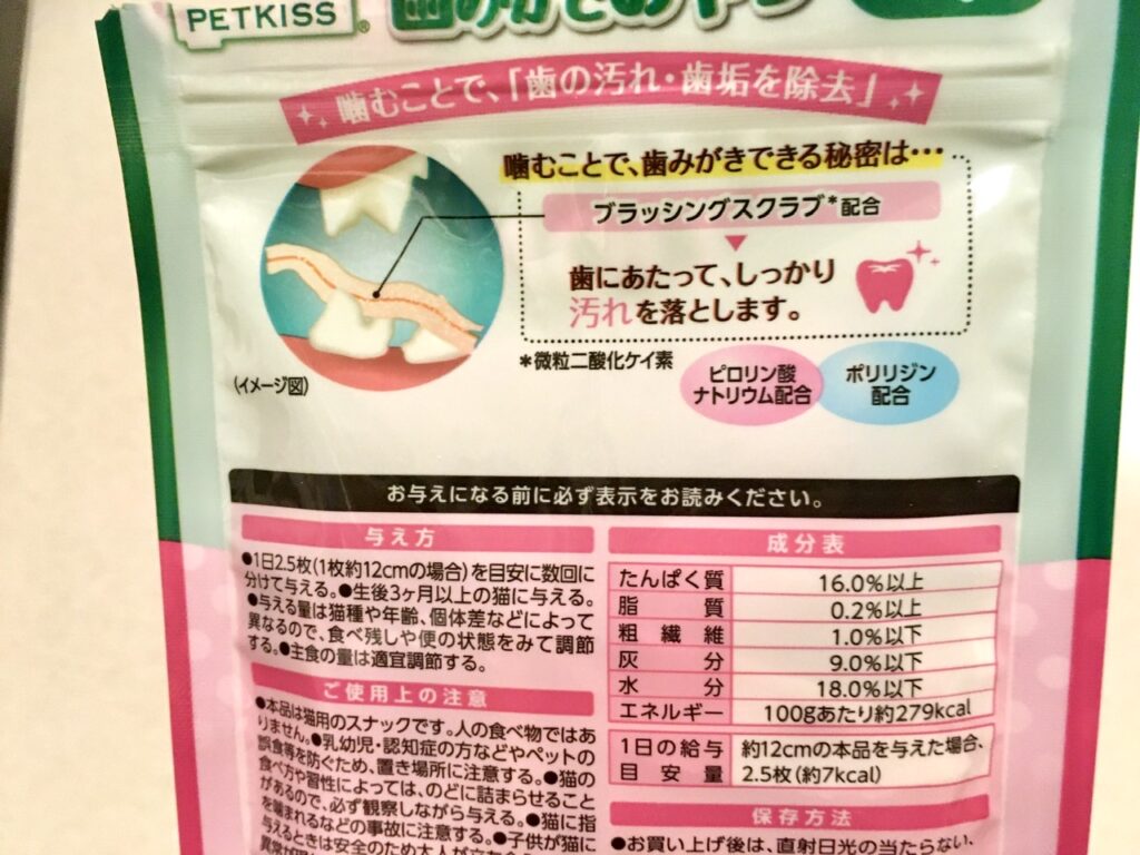 これまでカリカリタイプの歯磨きおやつを利用していましたが、歯が折れてしまったこともあり、近年注目されている微粒二酸化ケイ素やピロリン酸ナトリウム、ポリリジンなどを配合した製品を取り入れてみました。