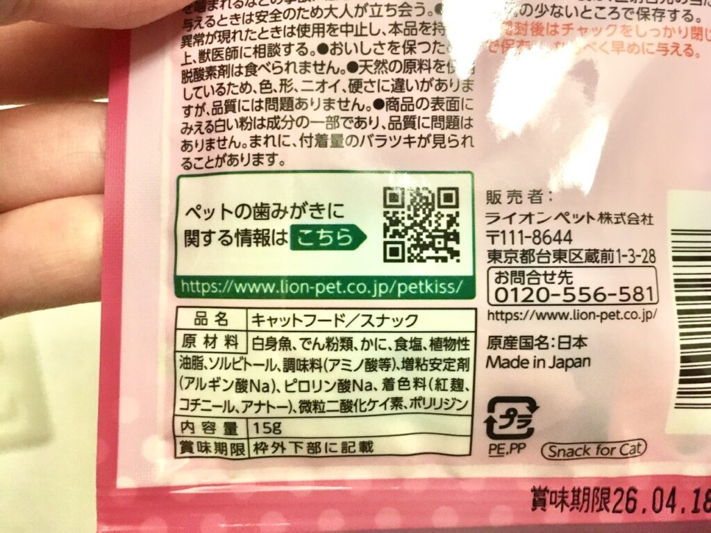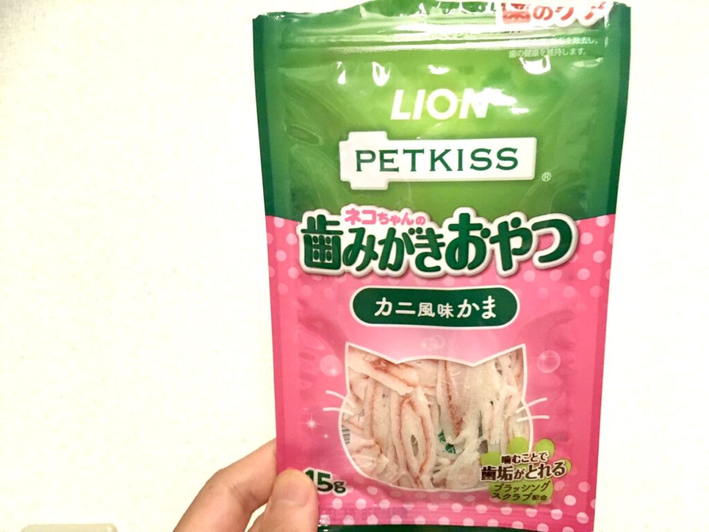 LION(ライオン)さんから発売されている「歯みがきおやつ カニ風味かま」です。ブランド名がPETKISSになるのでしょうか。