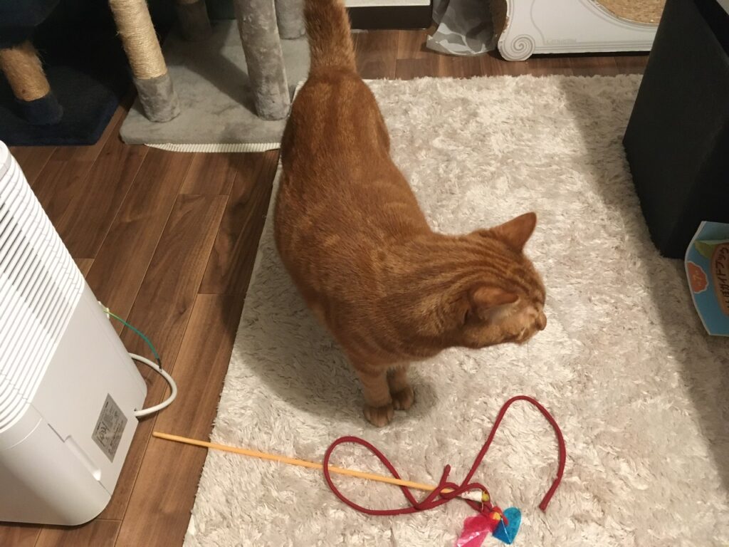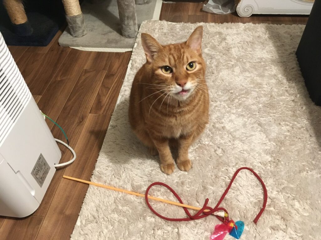 帰ってからももちろん猫圧。日課のオンライン英会話を終えると、おもちゃの前に座って見上げていました。何も言わずともその表情からビシバシと圧を感じます。お腹が空いているけれどまずは遊ばねば…!