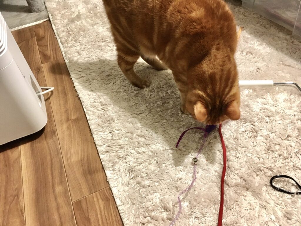 ということで新しい猫じゃらしを買ってきました。ダイソーのですが、興味津々で追いかけてくれます。