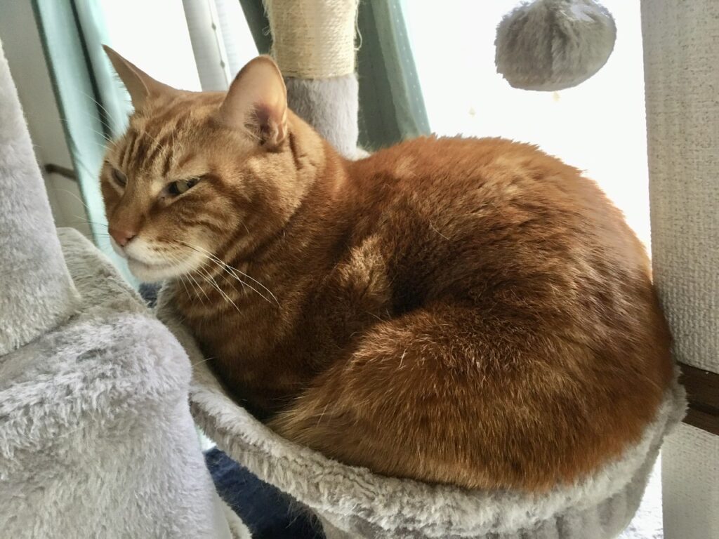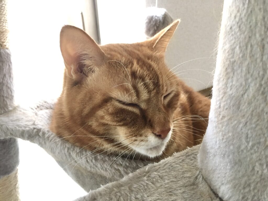 仕事に行く準備をしていると、いつもなら「どこ行くの?」とばかりに玄関までついてくるむぎさん。しかしその日は、キャットタワーでのんびりお昼寝中。