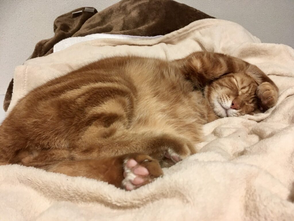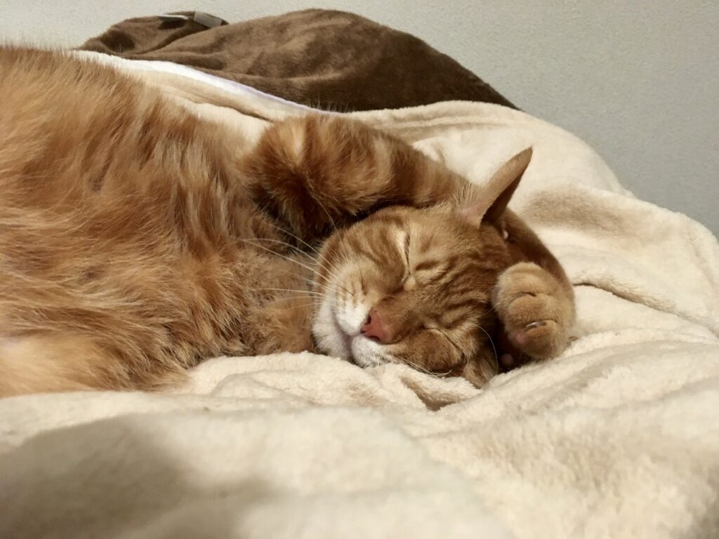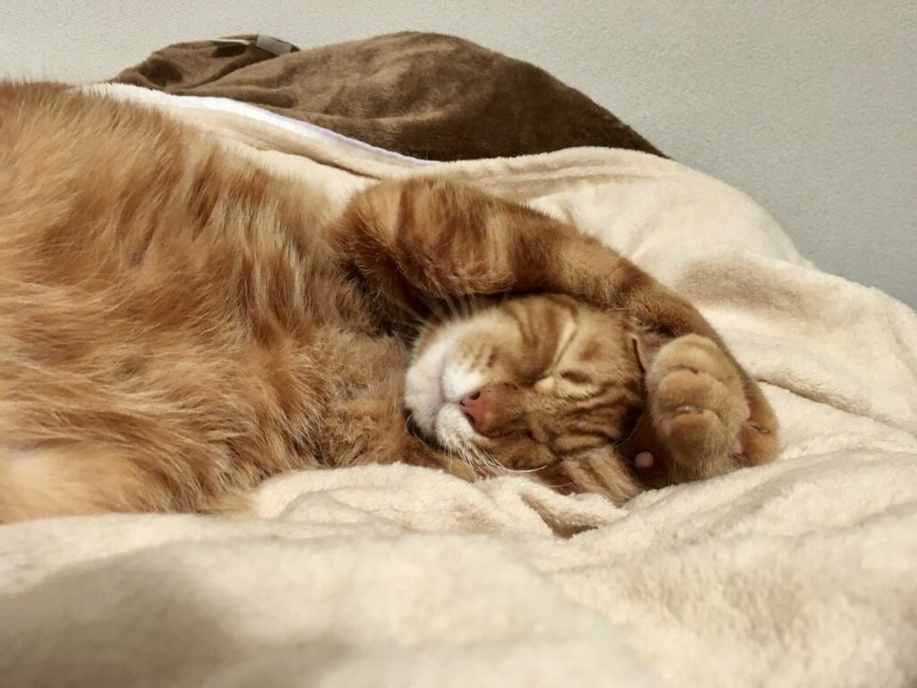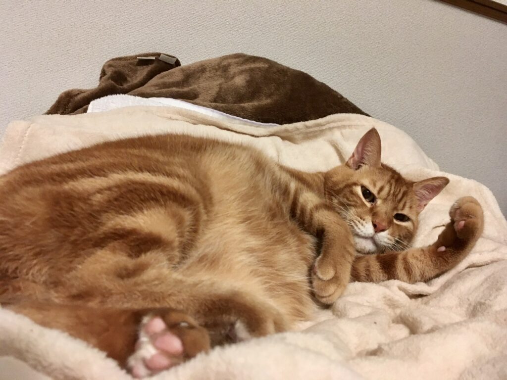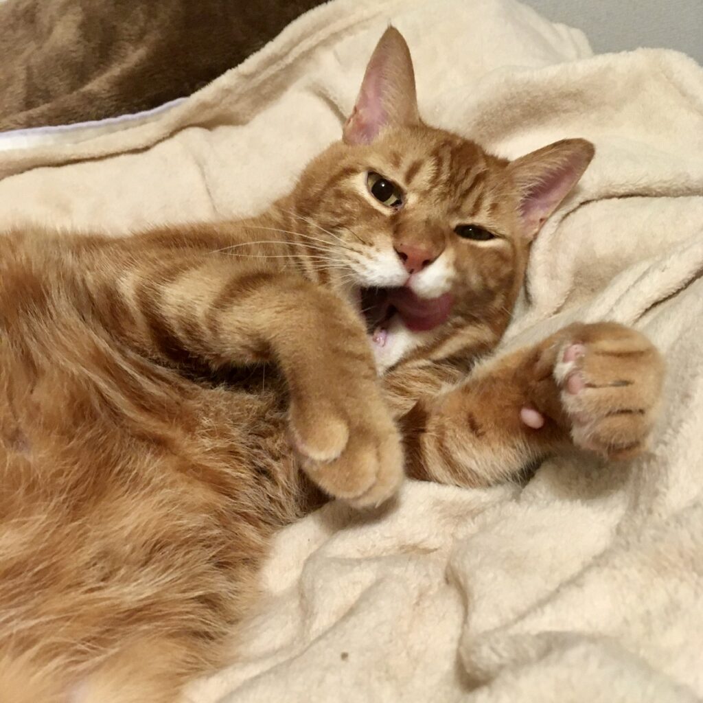 むぎさんがベッドで気持ちよさそうに顔を洗っていました。耳の裏まで丹念に。