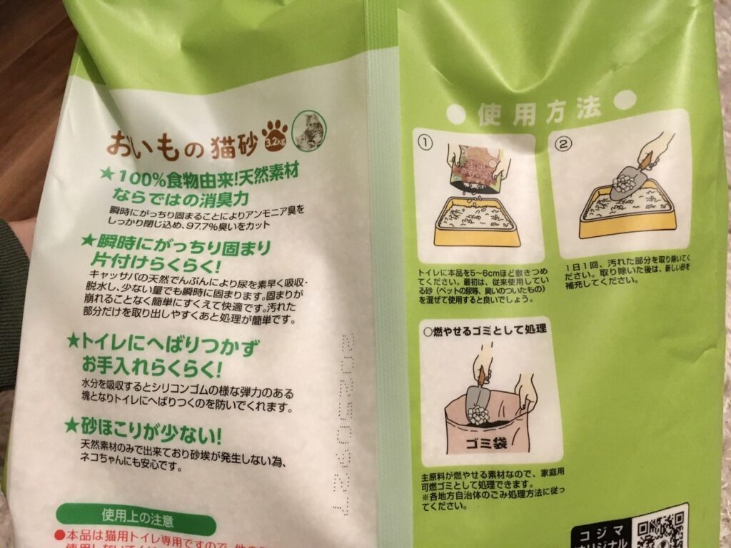 おいもの猫砂はギュッと固まるので無駄がない感じがするし、混ぜて使っても固まりがいいので、このまま紙の猫砂と合わせて使って行こうと思います。