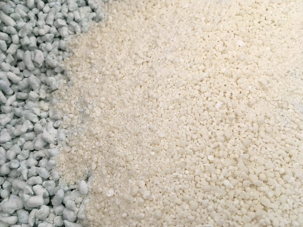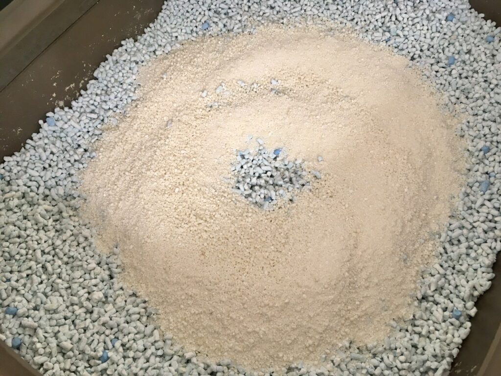 こんな感じで乳白色の細かい粒で、紙の猫砂に比べるとかなり砂感があります。粒自体も砂粒のように固く、触ると鉱物系のような感触です。粒は大小さまざま。
