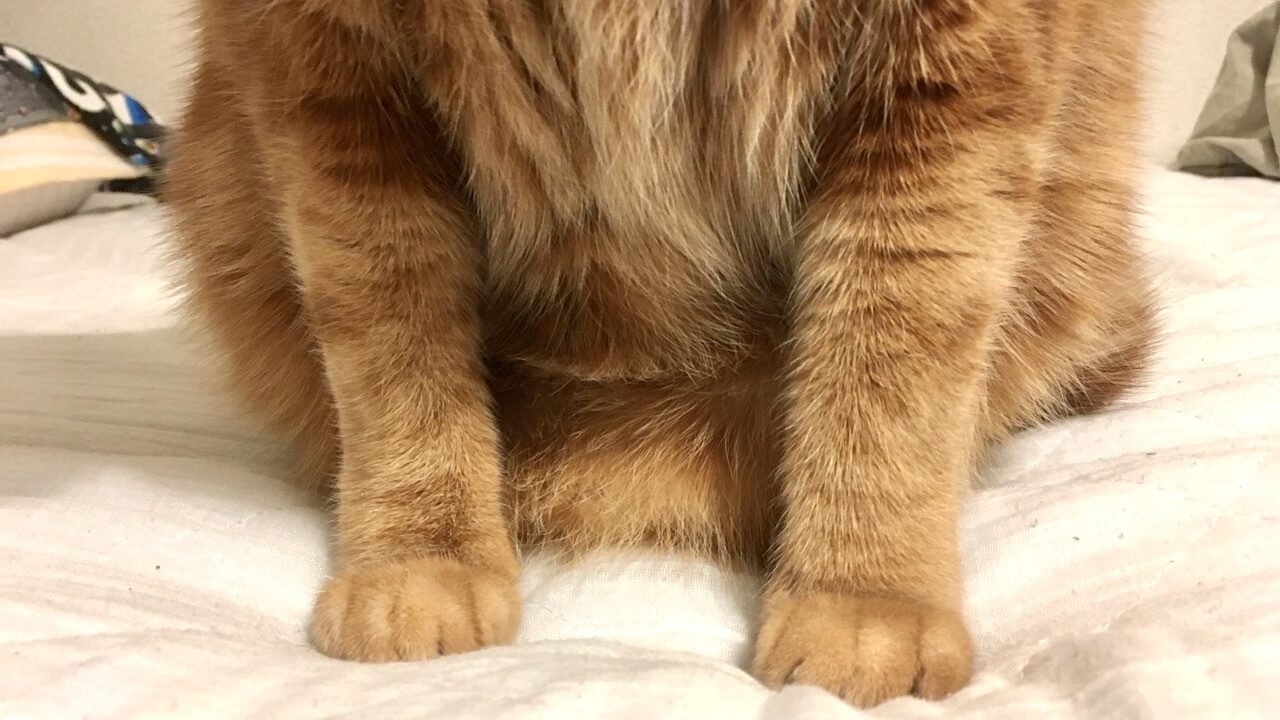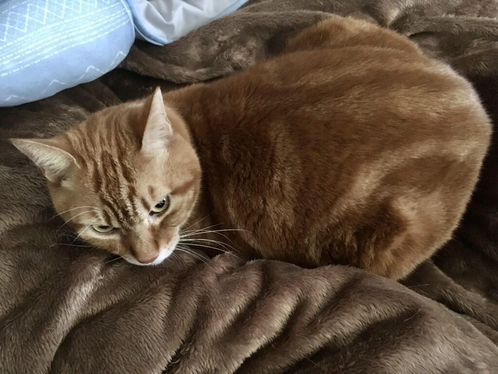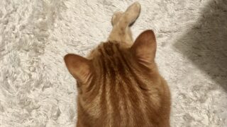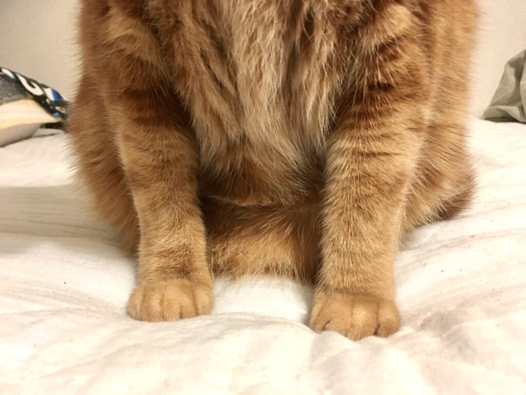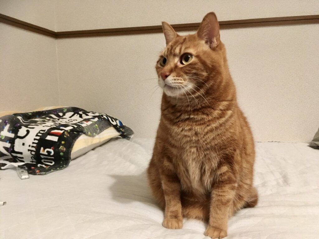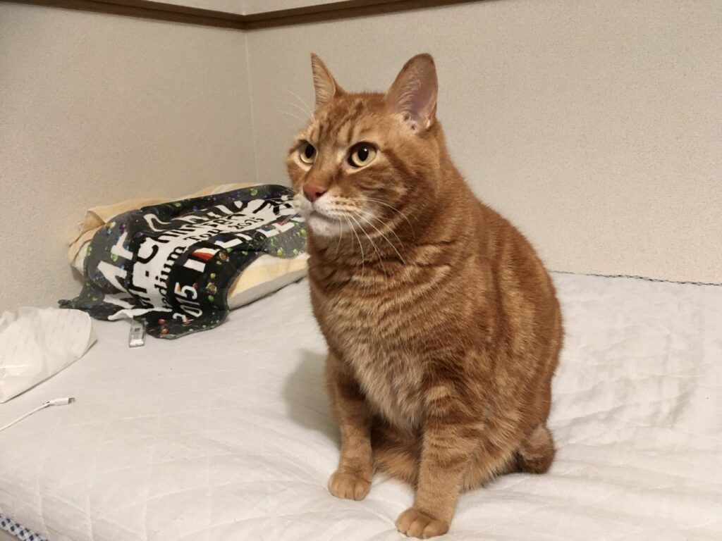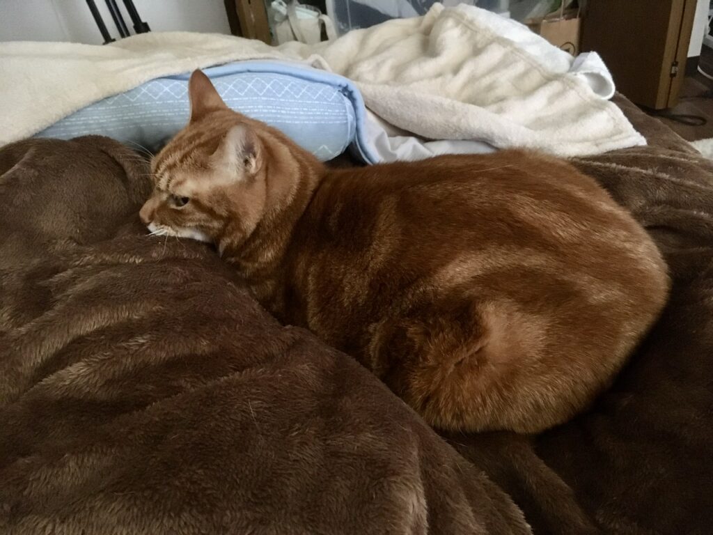それに伴い、むぎさんの寝床も少しずつ変化。今朝は体が重いと思ったら太ももの当たりにむぎさんがくっ付いて寝ていました。