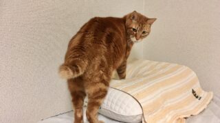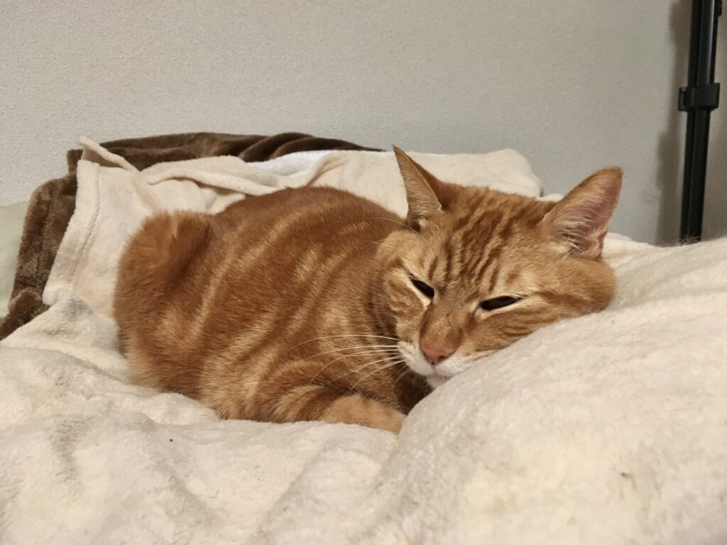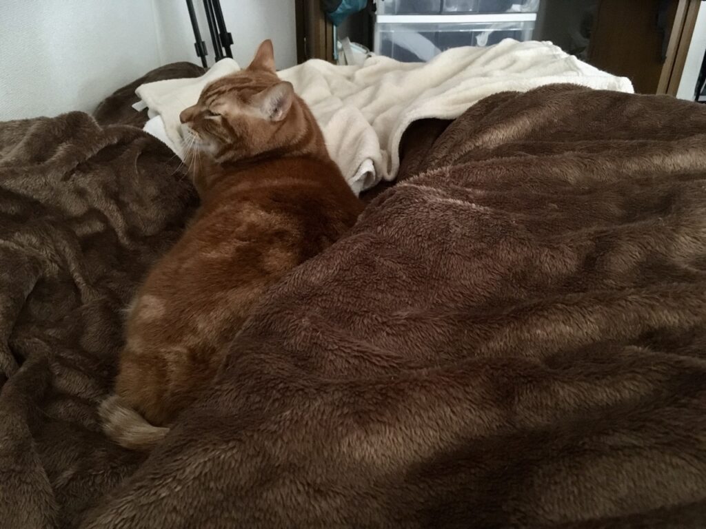 今宵ニンゲンをベッドにして添い寝をしてくれたむぎさん。最近は朝起きるのが少し遅くなり助かります。