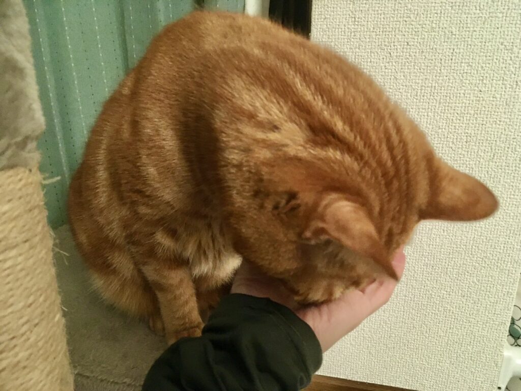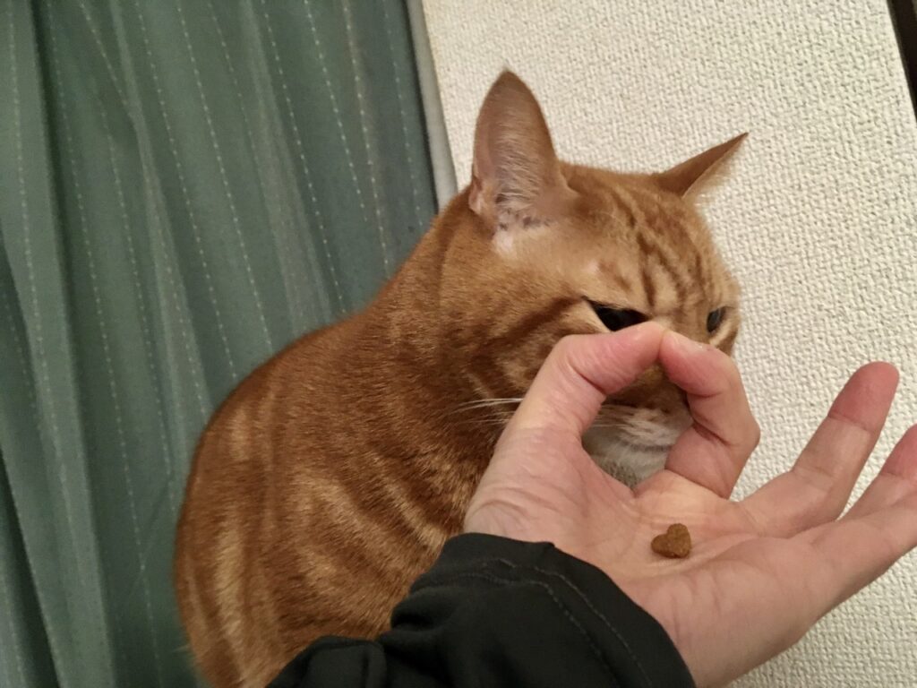 さて、最近よくSNSで見る「指で輪っかを作り手のひらにフードを乗せて食べ方で賢いか分かる」のあれ、むぎさんでも試してみました。