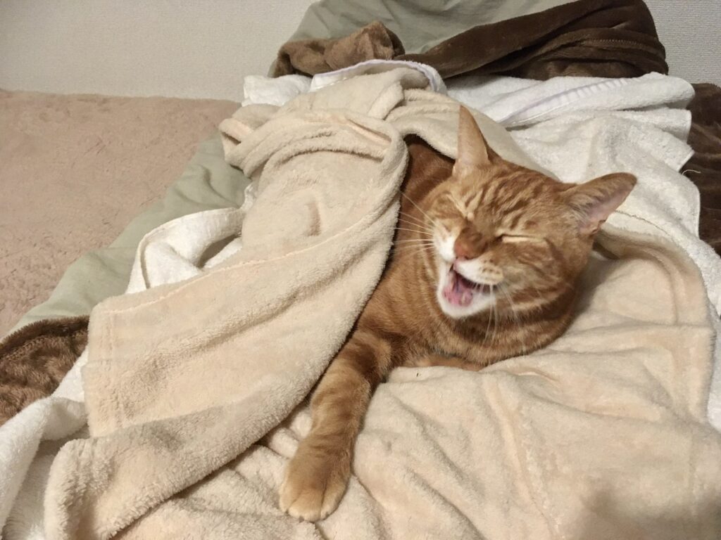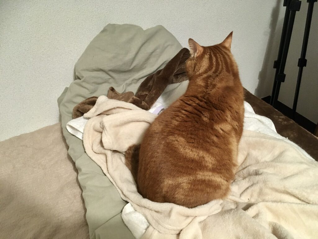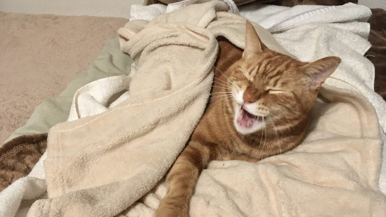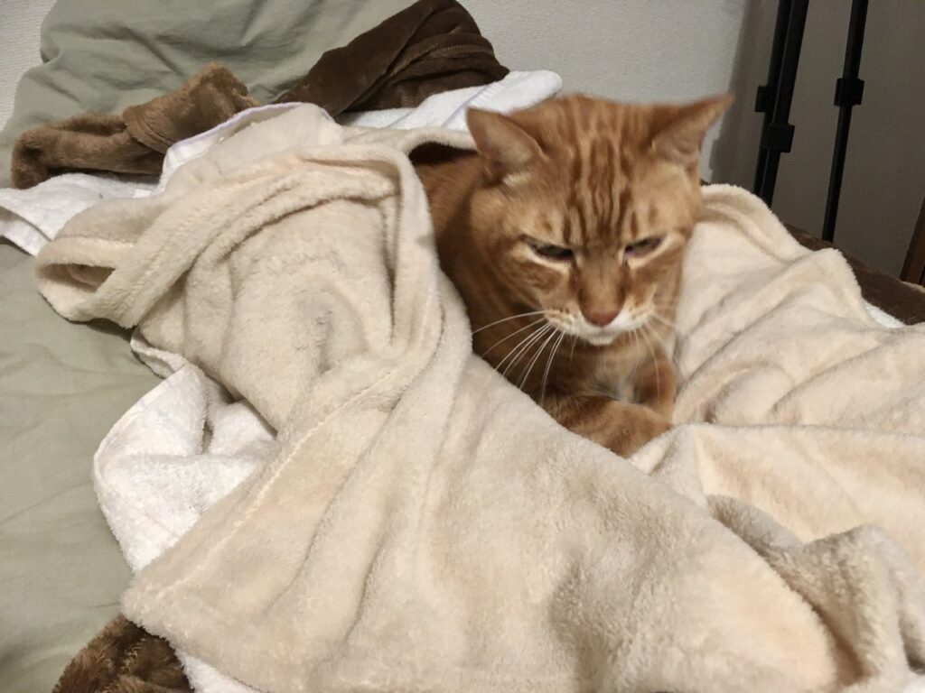 ということで、むぎさんには無理に包まず、毛布を置いておいて「好きなときに使ってね」スタイルが合っているようです。