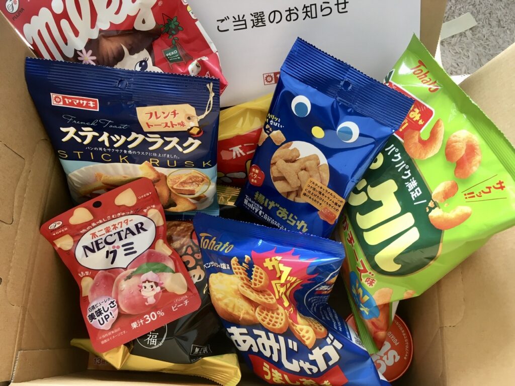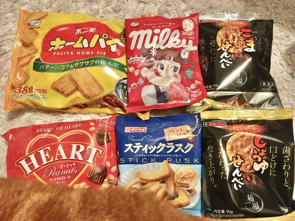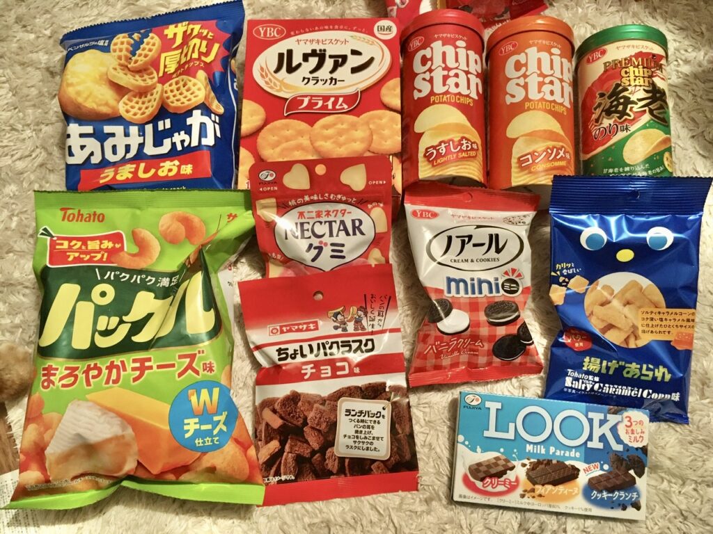 ちなみに入っていたのはこれらのお菓子たち。甘いのもしょっぱいのも入っていて止まらないやつです。