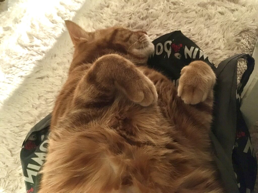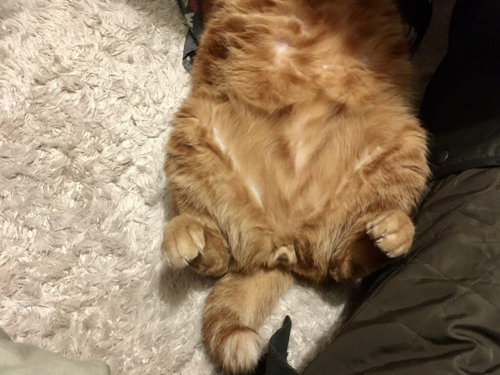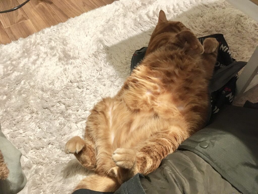 つい撮ってしまうヘソ天(とニャンチロリン)冬は夜寝るときにエアコンを切っています。むぎさんは布団に入ってこないので、布団の上で寝ていると寒くないのかな?と心配になります。