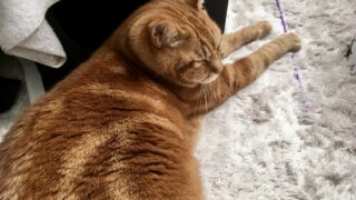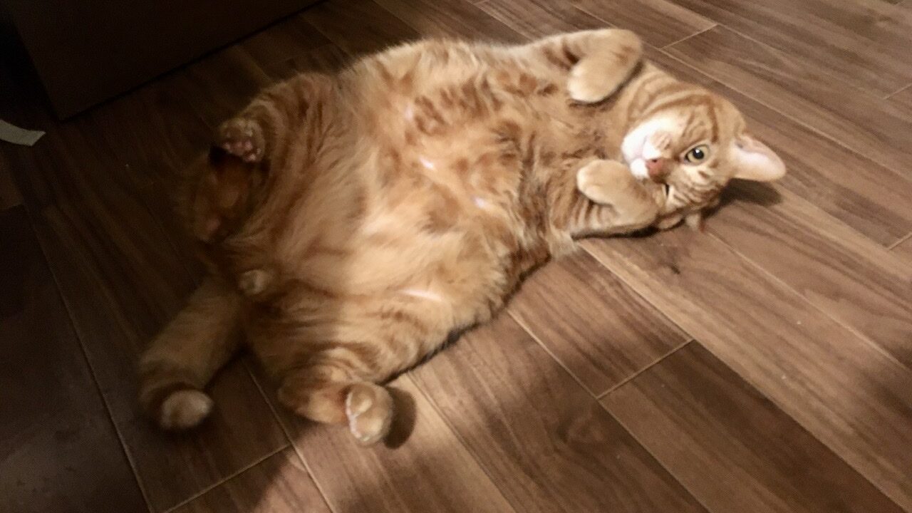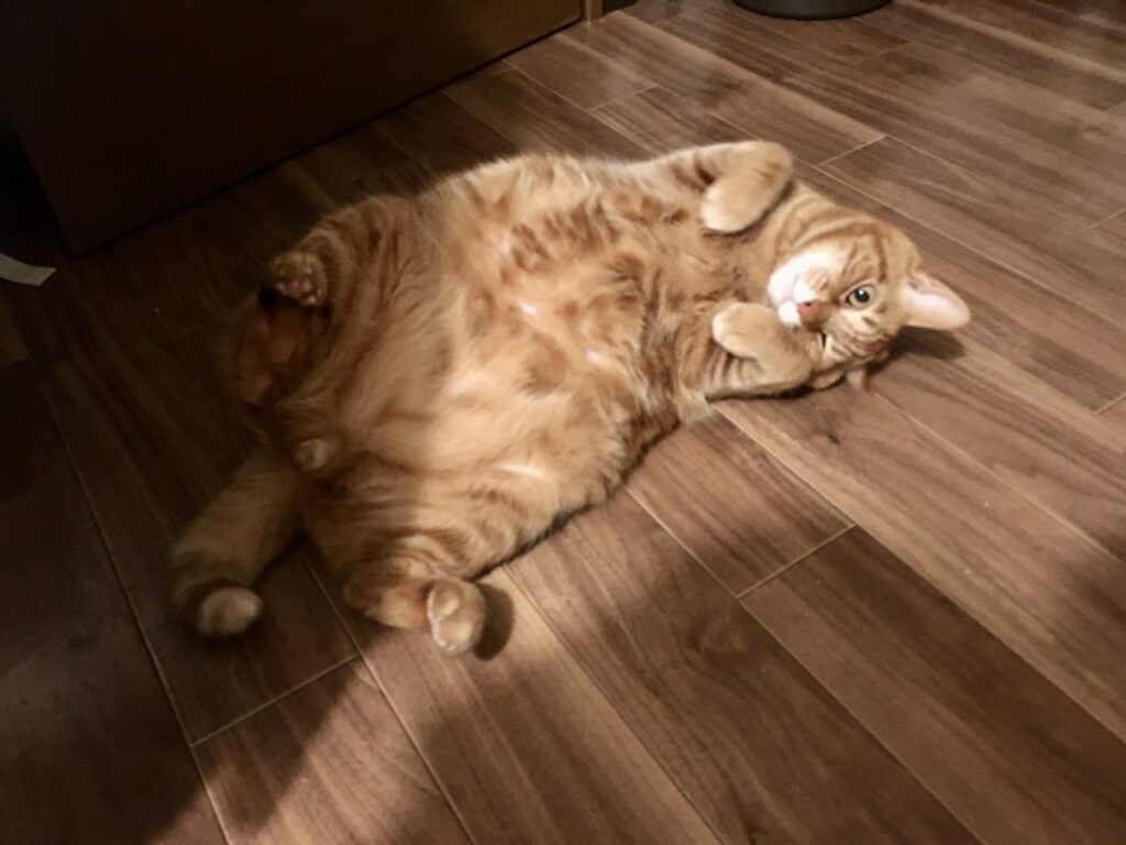 こちらはホットカーペットで暑くなったのか床でクールダウンしているむぎさん。