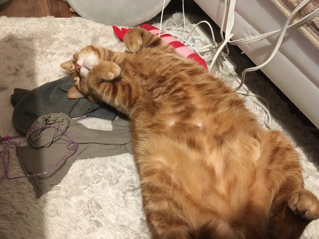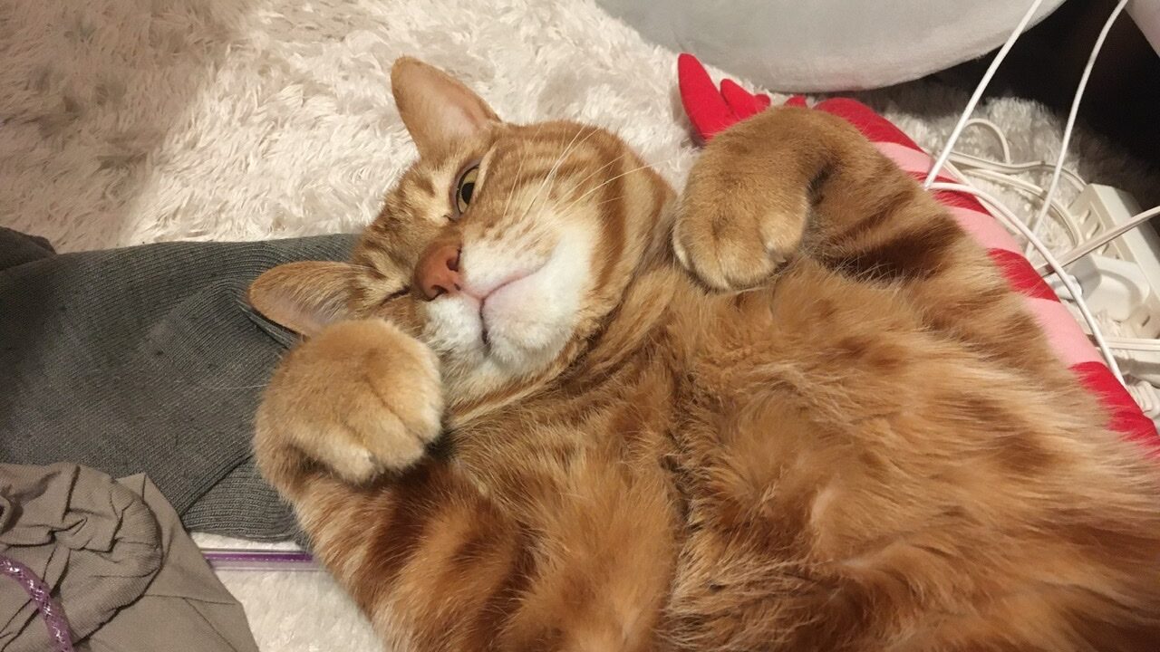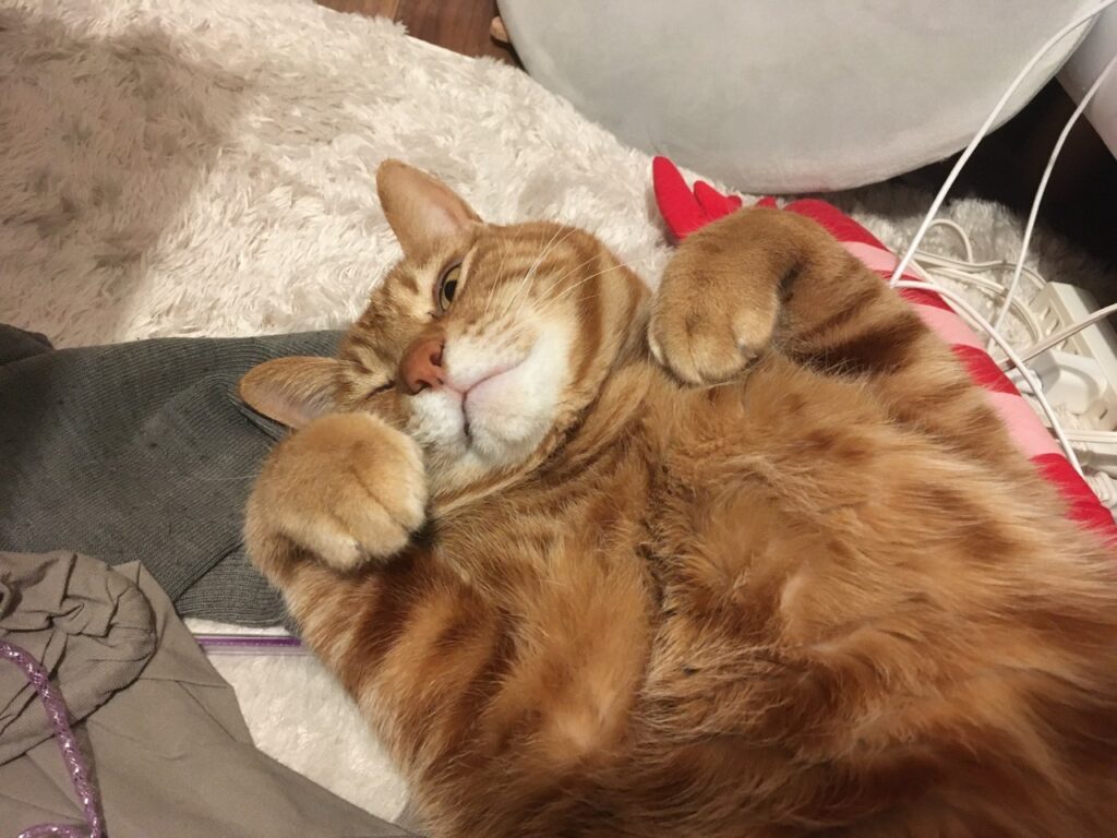 靴下的なものが散らばっていて恐縮ですが、夜の冷え込みがましになったことで、むぎさんのヘソ天がパワーアップしてきました。少し前まではホットカーペットにぺったりだったのですけどね。