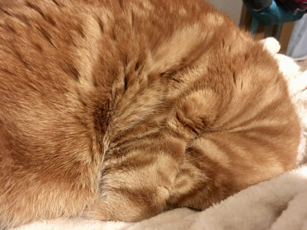 毛の模様のおかげでどっちが頭か辛うじて分かりますが、見事にお尻と頭が左右対称に。メガネをかけていなかったらどっちか見分けがつかないことでしょう(裸眼0.1なのでそもそも見えませんが)。