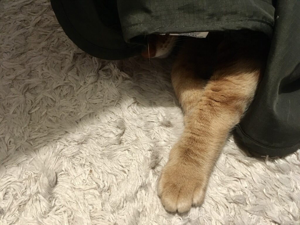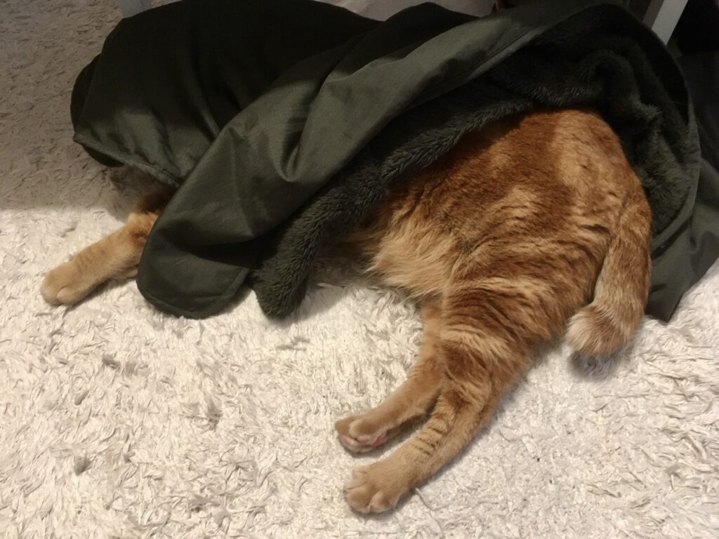 猫背はどこかへ行き、お腹からの放熱体制へ。しっぽが可愛い。