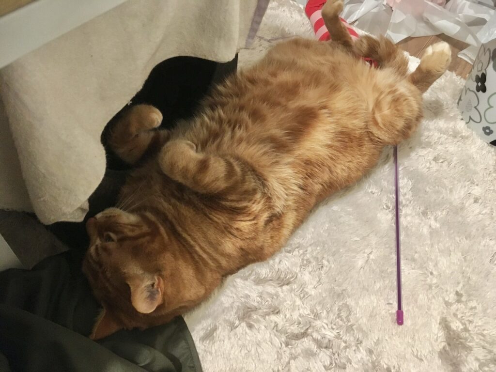 これにはさすがのむぎさんも「ちょっと暑い…」と動き出し、完全に仰向けで、両足はぱっかーん。