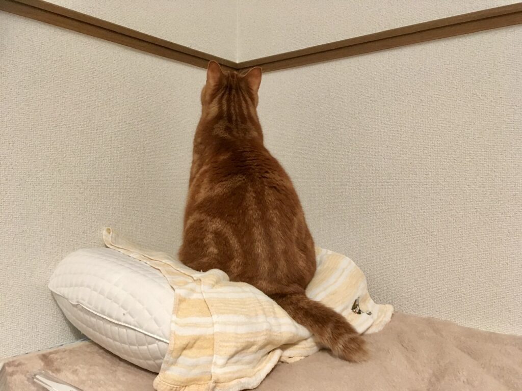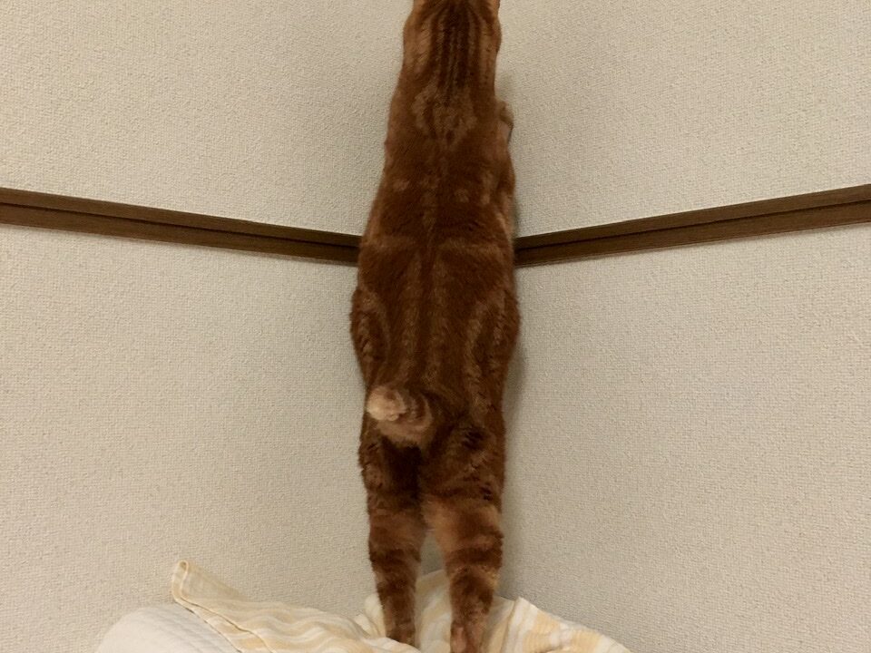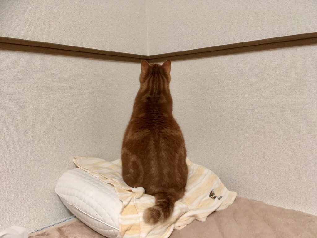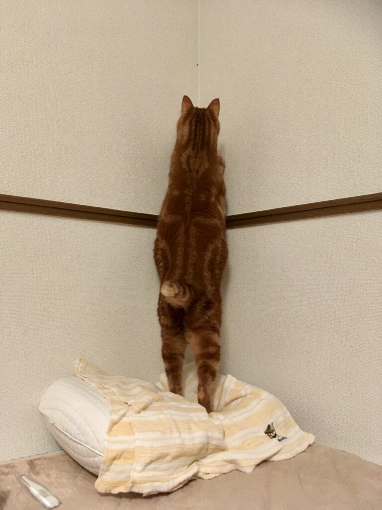 話は変わって、雨と言えば我が家名物のクモ。室内に出没したクモをむぎさんが見つけました。場所が枕元の壁の隅っこだったので、容赦なくまくらを踏みつけるむぎさん。