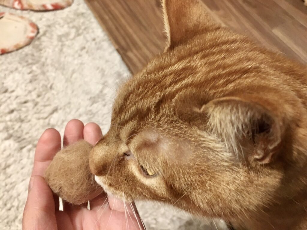せっかくなので回収した毛を丸め、猫が飛びつくという毛玉ボールを作ってみました。